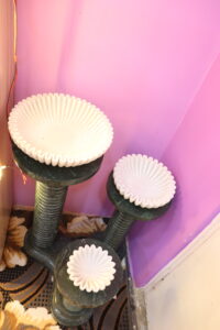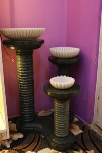 This striking green 3-pillared showcase piece is a perfect blend of traditional design and artistic craftsmanship. Made from natural stone or painted wood (as applicable), the structure features three finely carved pillars supporting a decorative arch or frame, creating a temple-like silhouette that exudes cultural richness. The green finish adds a refreshing and regal touch, making it an eye-catching accent for display shelves, pooja corners, or decorative niches. Ideal for holding small idols, candles, or miniature art, this piece not only enhances visual appeal but also adds depth and elegance to any space.
